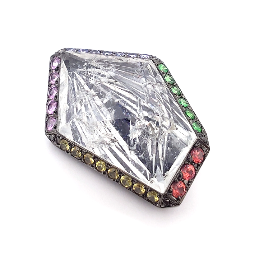 | 説明 | 天然のクラックも柄のように取り入れた、甲州貴石切子の中でも特にユニークな一石。 センターストーンは天然ウランを含み、紫外線(UVライト)を当てると、鮮やかなネオングリーンに蛍光するハイアライトオパール。クリアな透明の時も、UVライトを当てたネオングリーンの時も違う魅力を見せるには・・・一辺づつ色を変えたマルチカラー取り巻き! 透明石ゆえに切子細工が見えにくいのはもったいないと、下に同じサイズで磨り出した紫金石を敷いて柄を際立たせつつ、角度や光の強さで色の印象が変わります。とにかくカッコイイ!!! |