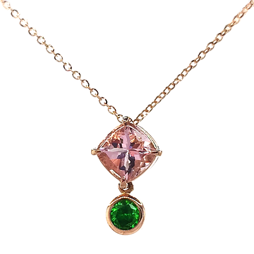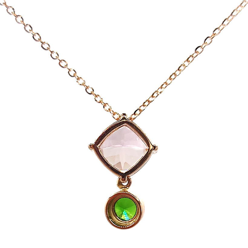 | 説明 | ピンクに煌めくスクエアクッションカットのモルガナイトの下に、濃い煌めきのデマントイドガーネットを揺らしたシンプルペンダント。シンプルだからこそ、反対色のカラーコンビが印象的です! |