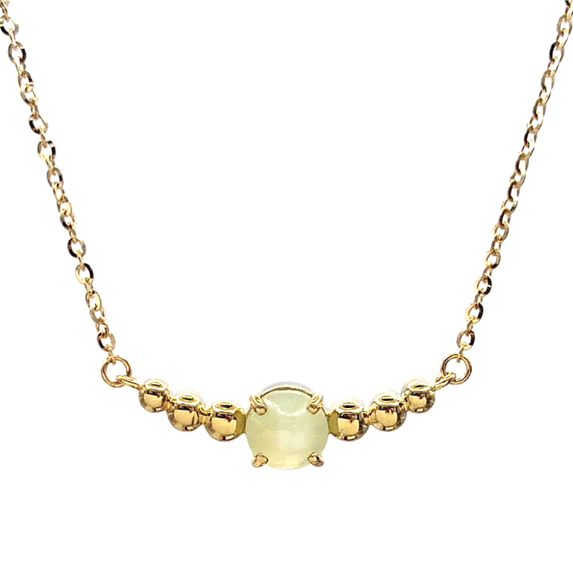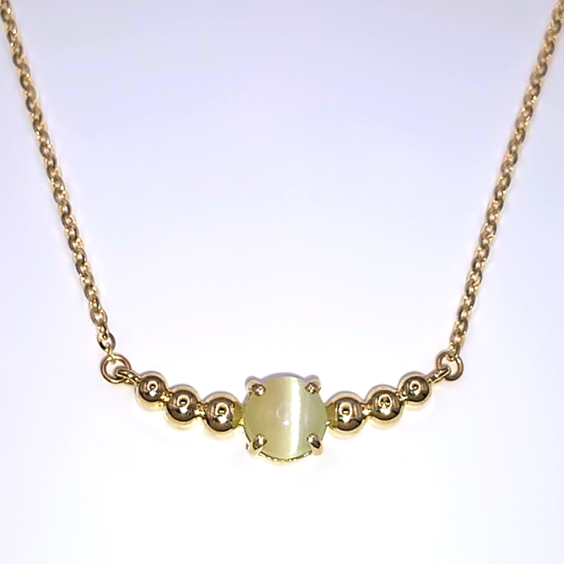 説明 ともするとお地味なイメージのあるキャッツアイ。せっかく2月の誕生石にもなったので、若い方にもカワイイ~と言っていただけるネックレスを目指して作りました!ラウンドのキャッツアイに合わせて、両脇に地金のボールを並べ、ぽこぽこと愛らしいデザインです!