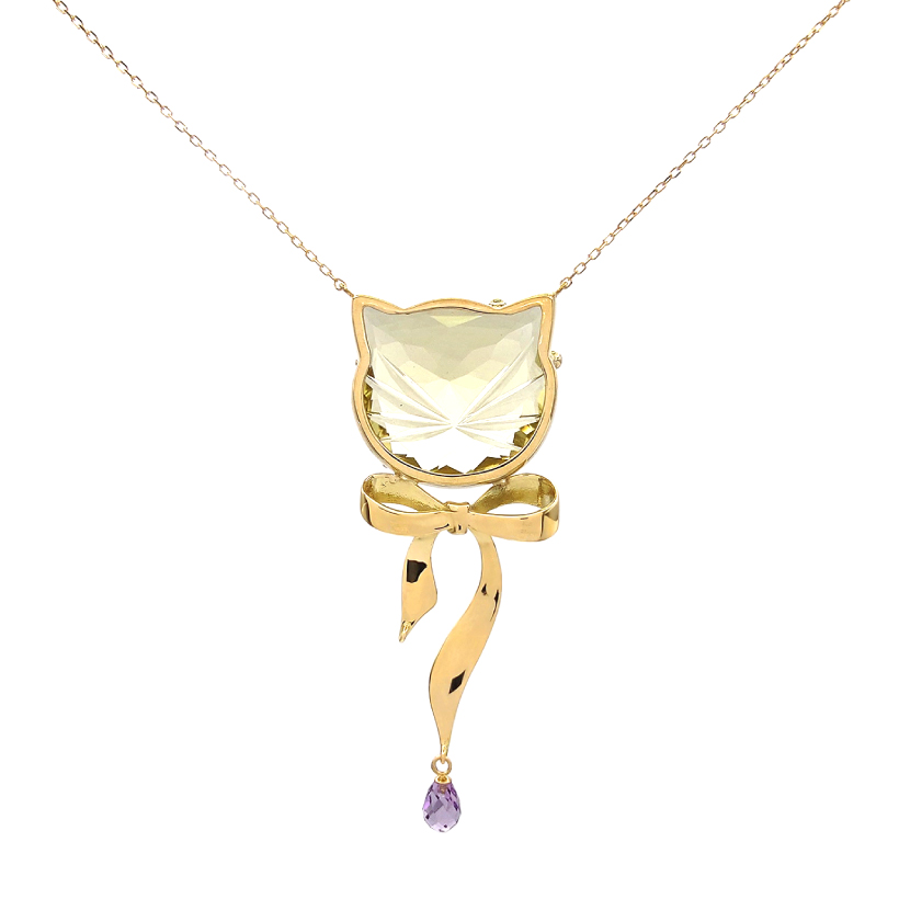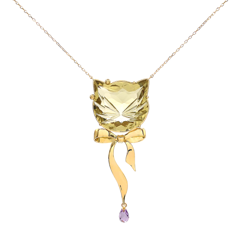 | 説明 | 猫の形のレモンクオーツに切子細工でおひげを描いたユニークジュエリー。にゃんこと言ったらリボンよね?!と首にリボンを着け、ドロップカットのアメシストを揺らしました。猫の耳の片側の爪をわざと大きく作り、リボンのようにしたのもポイントです! |