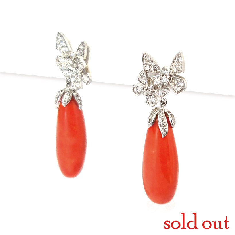 商品番号 06-76-5160-550 商品名 ドロップ珊瑚 バタフライデザイン 直結ピアス 地金 K18WG 素材 珊瑚/ダイヤモンド(計0.8ct) 説明 大きなドロップ珊瑚の上に二匹の蝶が舞います。ゴージャスでカワイイ、迫力のピアスです! ← 愛らしいピンクの花びら珊瑚リング ムーンスターのカジュアルペンダント →