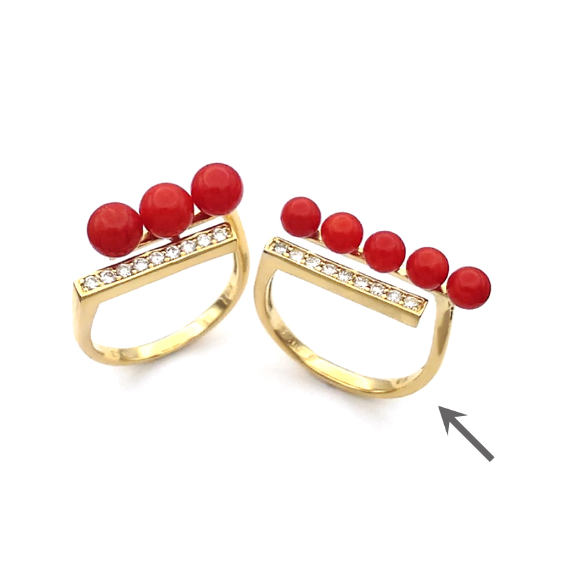 説明 センターに切れ目があり両側にデザインのあるフォークリング。両側から丸珠珊瑚とダイヤモンドを一列並べることで、つなぎ目の見えない2列の不思議な一文字リングになりました!素材違いはこちら→
