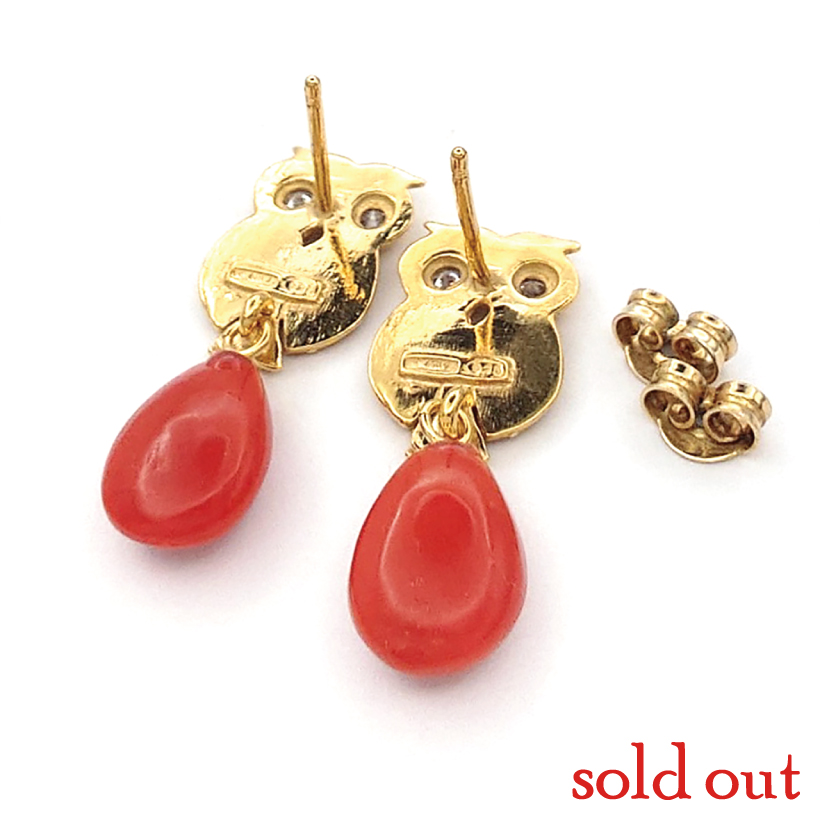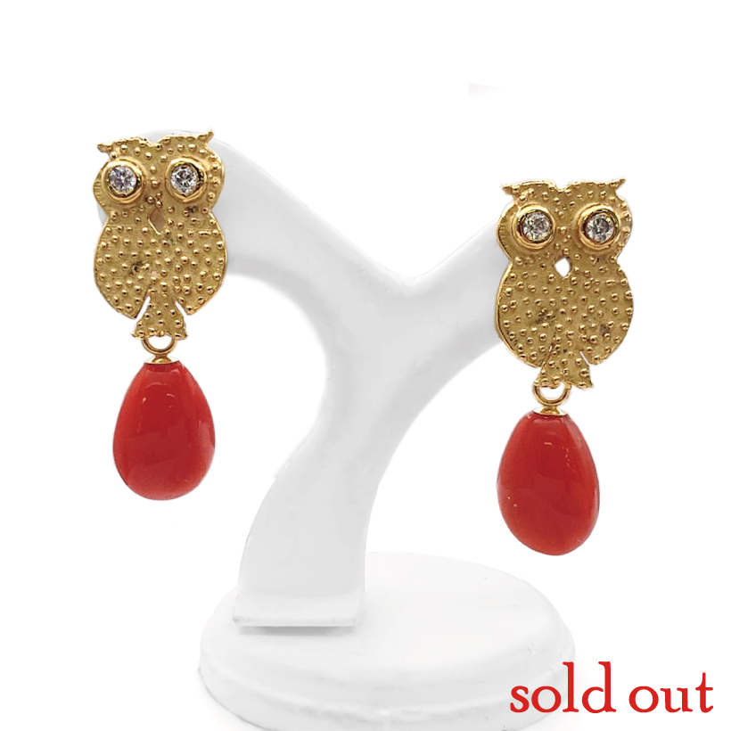 | 説明 | 梟モチーフのピアスの下に何かを下げたい!という要望を受け、珊瑚を揺らすリフォーム加工を承りました。珊瑚の赤が良いアクセントになっています♪ |