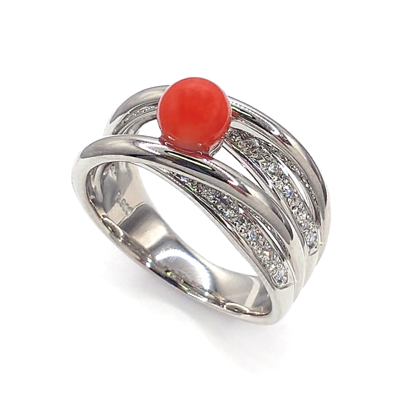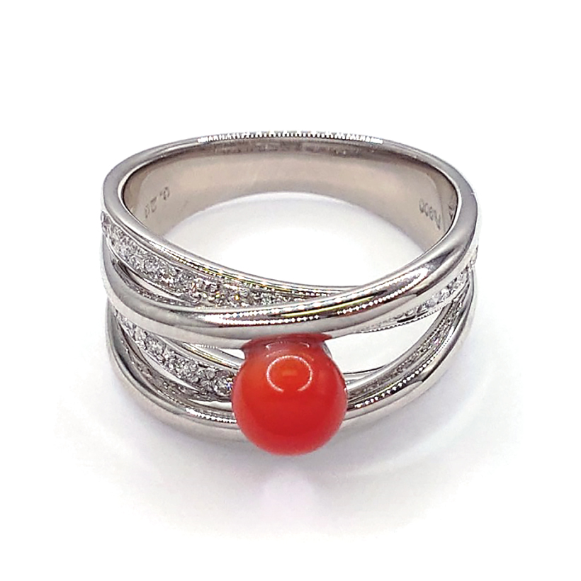 | 説明 | 地金とダイヤモンドの曲線ラインが重なる幅広リングに濃い赤の丸珠珊瑚を留めました。たっぷりと地金を使い、シンプルながらにラグジュアリーな印象です! |