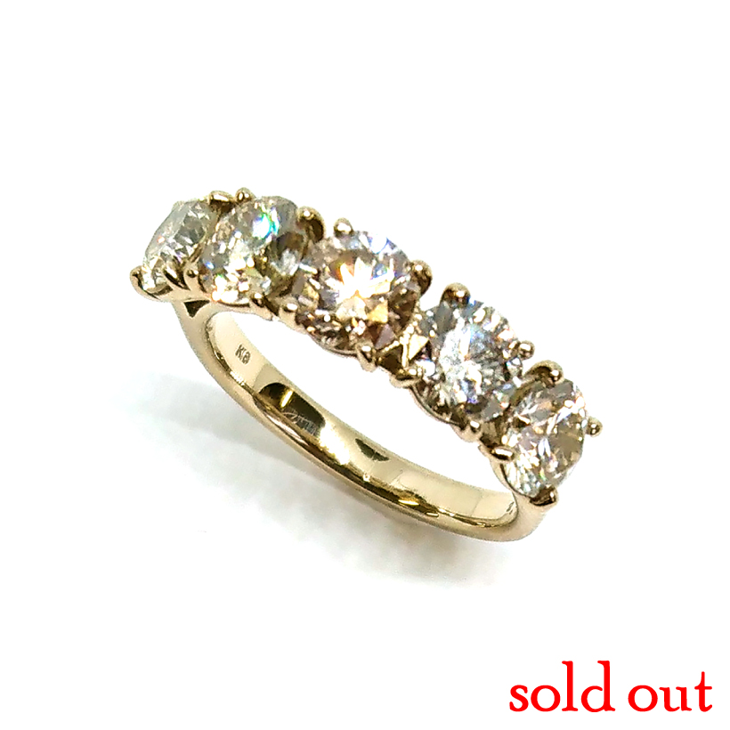 | 説明 | メレダイヤで製作することの多い一文字リング。1石0.6ctの大きなダイヤでトータル3ctの迫力の一文字リングを作りました!ブラウンダイヤ使うことでキラキラと華やかながら馴染みのよい仕上がりです |