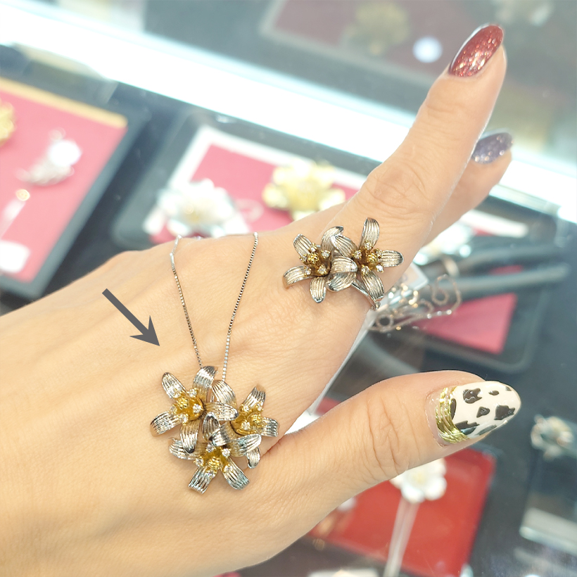 | 説明 | 可憐な橘の花を立体に組み合わせた人気のペンダントネックレスです |