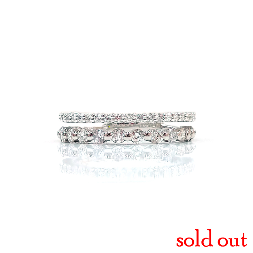 | 説明 | 大きさの異なるダイヤの一文字リングを二本重ねているように見えるピンキーリング。ダイヤの大きさだけでなく留め方も変えることで二本の違いを際立たせています 素材違いはこちら→ |