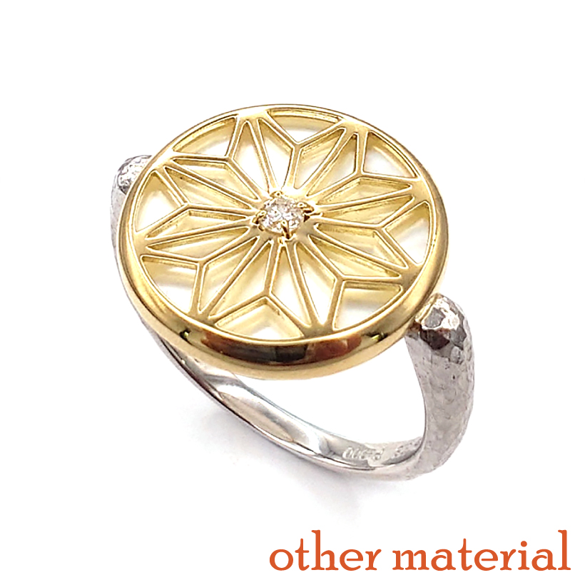 | 説明 | 角麻の葉文様の下に同じサイズで磨りだした黒蝶貝を敷き、幻想的な輝きを持たせました。リングのデザイン部分と腕の部分を地金を変えデザイン部分が浮出すような印象に仕上げました 素材違いはこちら→ |