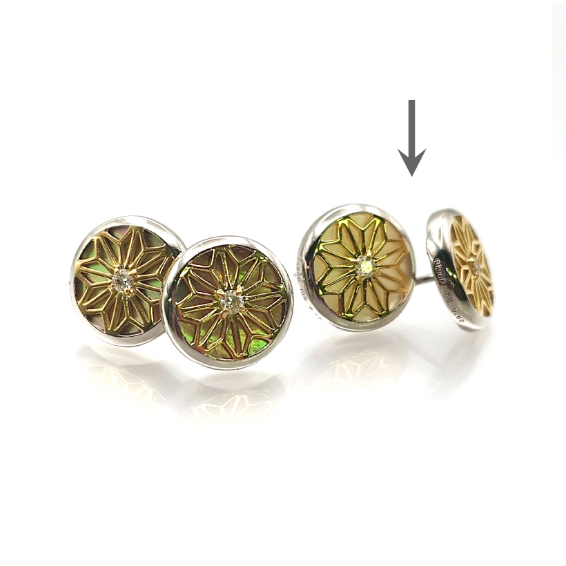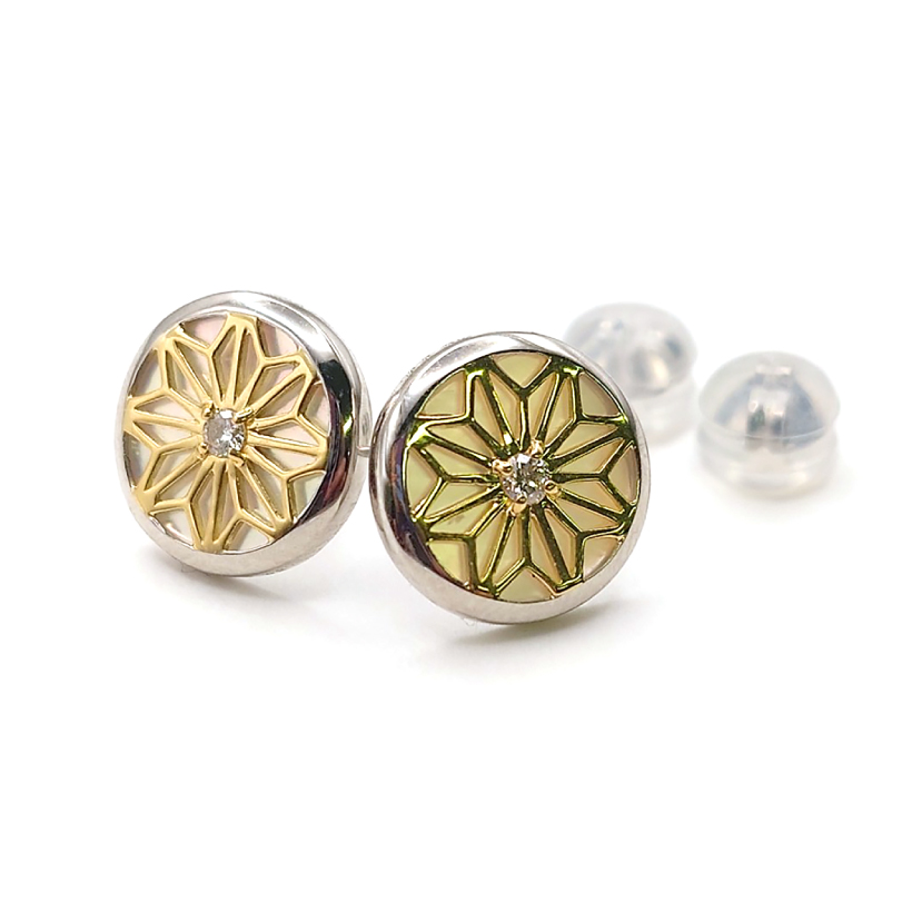 説明 麻の葉文様の下に同じサイズで磨りだした白蝶貝を敷き、透明感のある輝きを持たせました。ピアスの丸い縁はプラチナで、中の麻の葉文様はイエローゴールドと地金を変え、デザイン部分が浮出すような印象に仕上げました