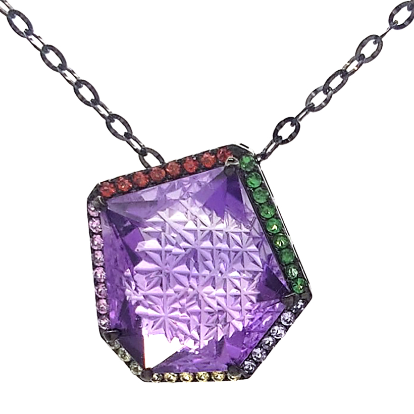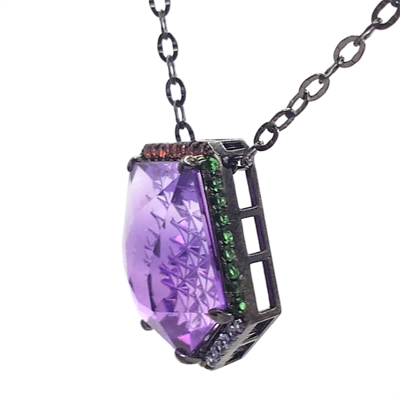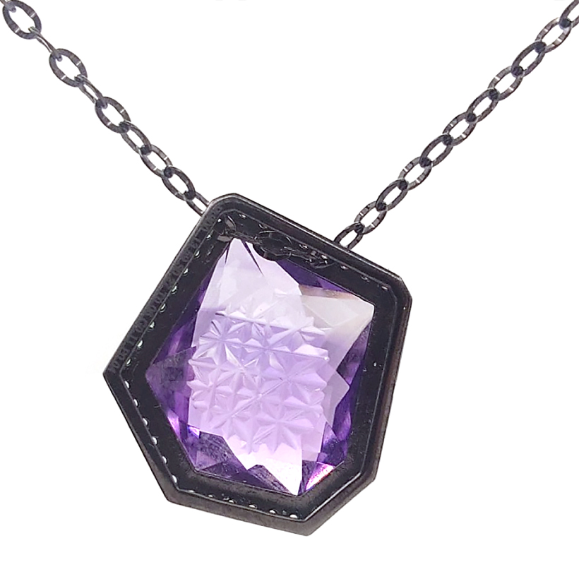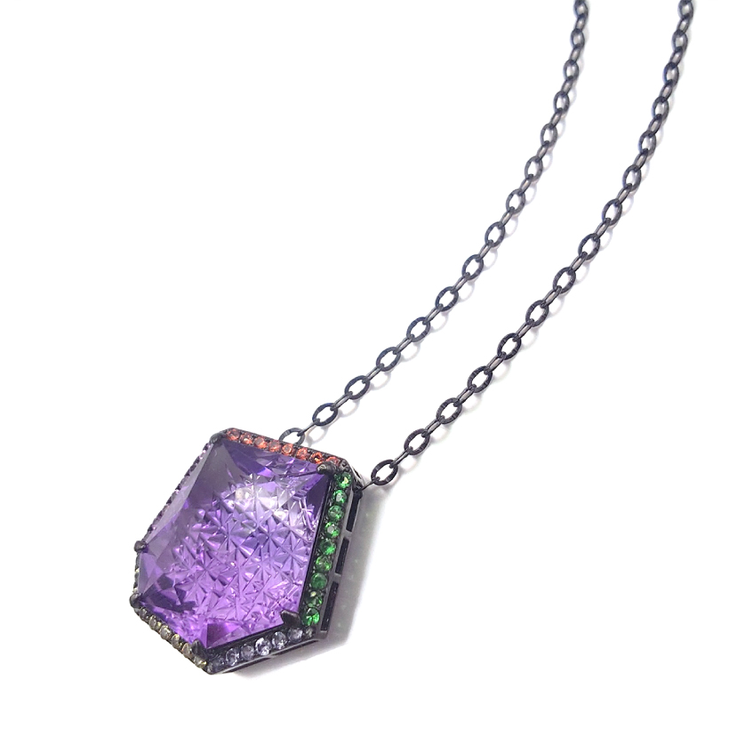 | 説明 | 鮮やかなパープルが美しいアメシストに切子細工。このパープルを楽しむには・・・もっとカラフルに!と各辺を異なる宝石で取り巻きました。チェーン通しの位置を変えれば見え方も変わりますョ♪ |