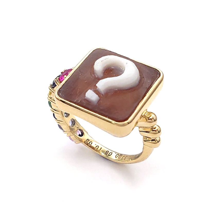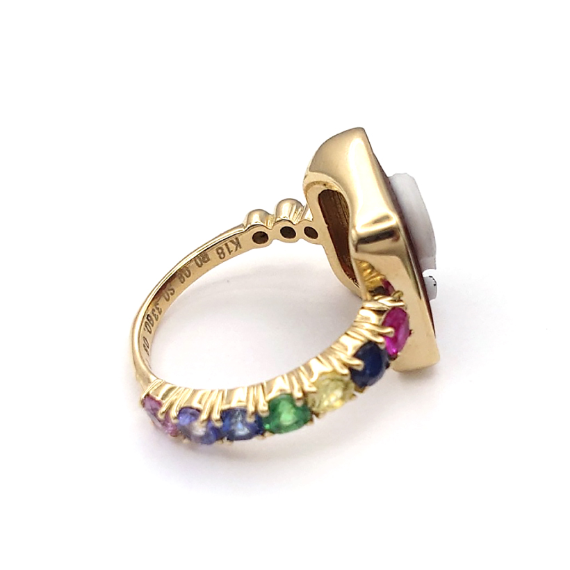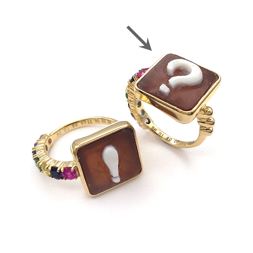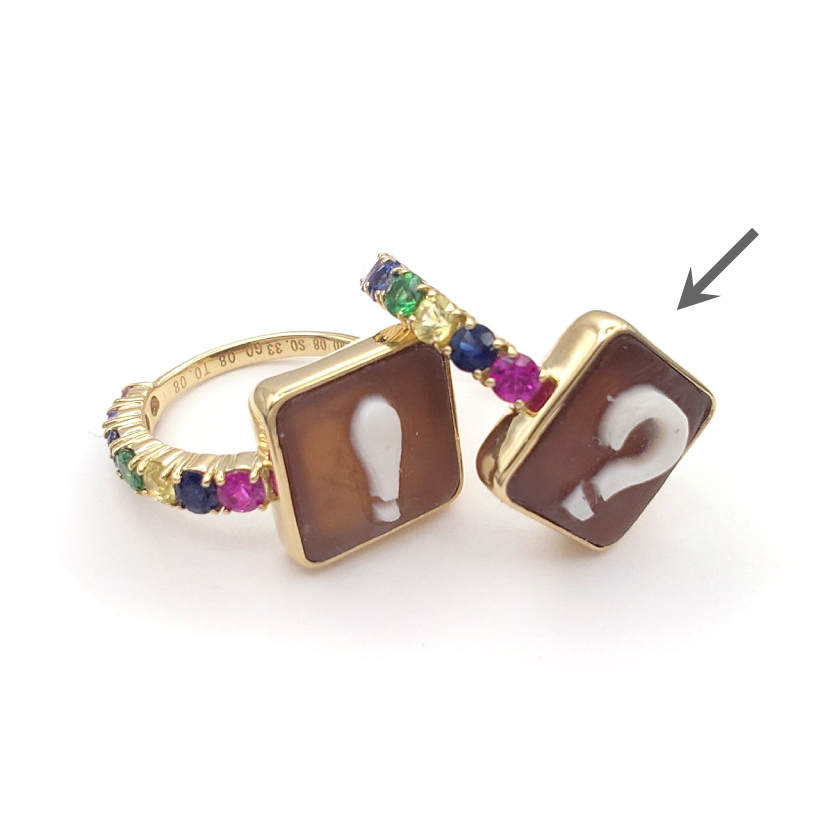 説明 思わず笑っちゃうファンキーカメオ!ガツンと見てみて~!という主役級ではなく、え?!それって<?>?!と目線を惹きたいとピンキーリングにしました。腕のデザインが見えやすいピンキーリングなので、アシンメトリーに虹色リング腕に楽しくまとめました♪